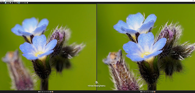 Astfel, combinând DOF-ul mare chiar la diafragme deschise cu funcția Focus Stacking putem fotografia orice subiect astfel încât acesta să fie complet in zona de clar și să nu fim nici afectați de fenomenul difracției. Implementarea mi-a permis chiar să fotografiez subiecte vii care se mișcau ușor, ori subiecte mișcate de adierea vântului. Aveam cam 6 situații reușite din 10. Aparatul realizează la o declanșare o succesiune de cadre - setabile de la 2 la 199 cadre - mutând focalizarea din obiectiv după fiecare expunere din succesiune. expunerea durează sub o secundă în general, iar stabilizarea face ca acele expuneri succesive să fie relativ aliniate. Urmează a doua etapă a funcției, etapă care are 2 variante. Prima e salvarea acelor cadre ptr a putea fi ansamblate ulterior în calculator ca un cadru focus stacking folosind Photoshop sau diverse programe dedicate. În forma asta putem avea până la 199 de cadre ORF adică Raw la rezoluție maximă, ptr fiecare expunere.